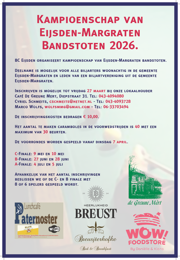 28-02-2026 : Voor de liefhebbers : BC Eijsden organiseert kampioenschap van Eijsden-Margraten bandstoten. Zie affiche.